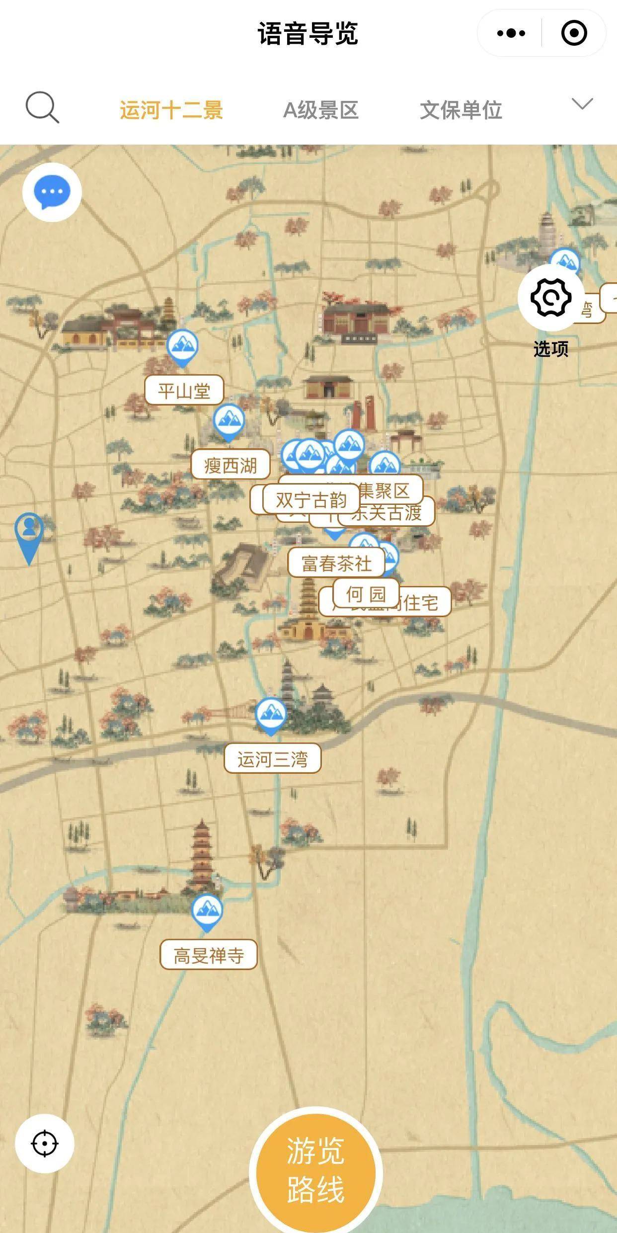 除了“一键导航功能,运河十二景、A级景区、文保单位还提供自动讲解、VR全景等功能。”市文化广电和旅游局相关人士介绍,点击旅游景区进去后,不仅有详细的景区文字简介,还有自动语音讲解和720度VR全景,可以为旅行者游览景区实现电子导游功能。“如果感觉手绘地图不习惯,也可以切换成为普通的地图,同样具备这些功能。”