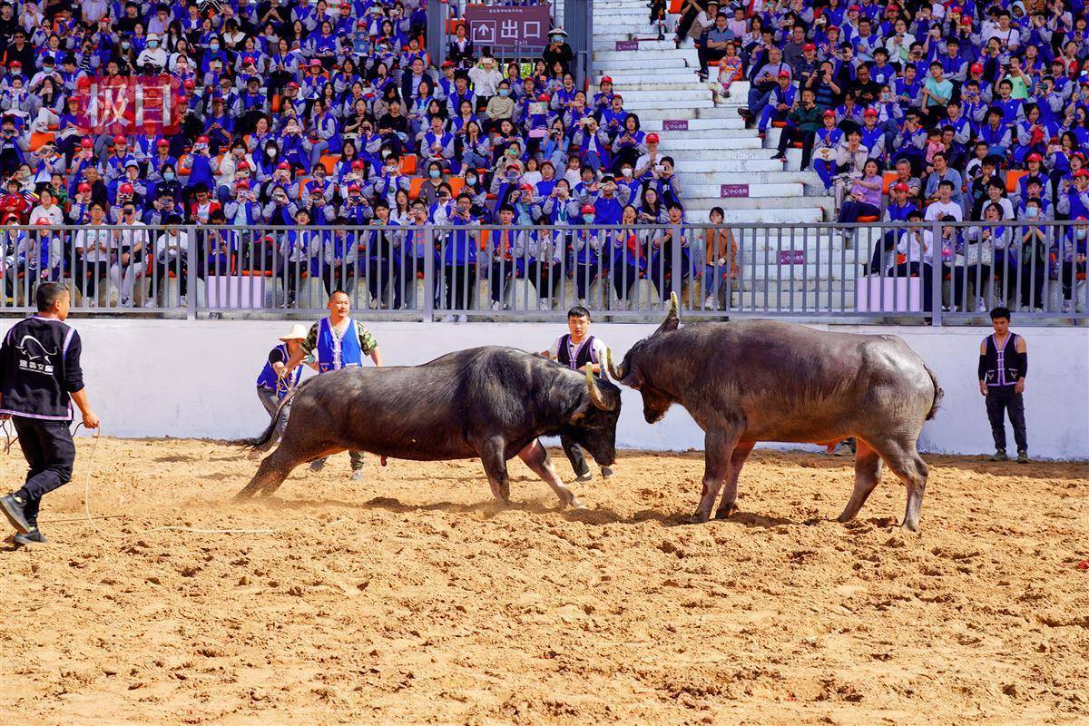 当天,斗牛场站台坐满了观众,随着大铁门打开,操牛手刚松开绳子,两头牛立刻撒开蹄子冲向对方,头顶头,怒红了眼。当两对牛角激烈地碰撞在一起,现场热烈的气氛更是瞬间被引爆,全场观众纷纷鼓掌欢呼,惊叫连连。每轮战罢,拆牛手和牛上演人牛拔河,也让数千名观众叹为观止。