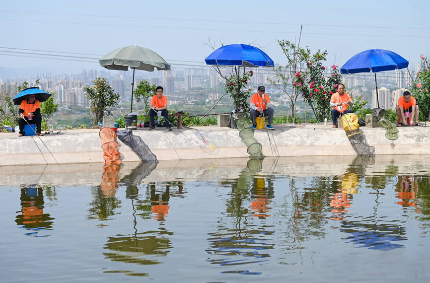 钓鱼选手在金鳌田园金鳌三社庆元鱼塘展开比拼,进行4.5米内的手竿钓混合鱼重量赛,通过抽签确定钓位,在100分钟时间内,中鱼的欢呼声此起彼伏。大家在湖光山水之中,用钓鱼竞技感受丰收喜悦。