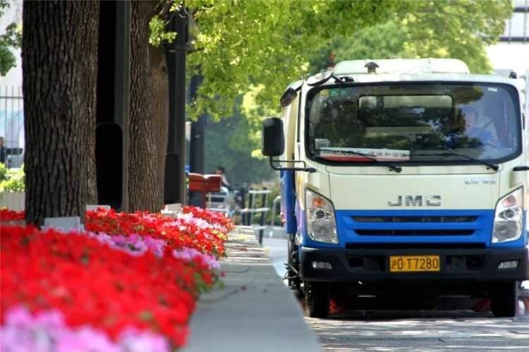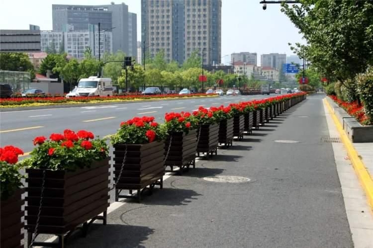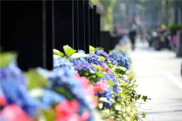 在四平路中央隔离带,238组花箱打造以杜鹃叶山茶为主,绿叶粉花比格海棠、常春藤、蓝色八仙花、大丽花为辅的花箱小景。