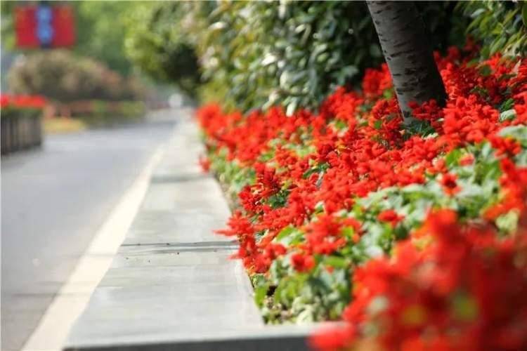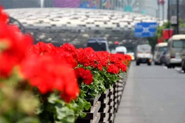 四平路机非隔离带种植天竺葵8944组,十几朵小花挤在一起形成一个个红色的“爆花球”,近看花色鲜艳开花层层叠叠不见叶,缤纷绚烂,远看绿叶从中一盏盏红灯笼扮靓街头。