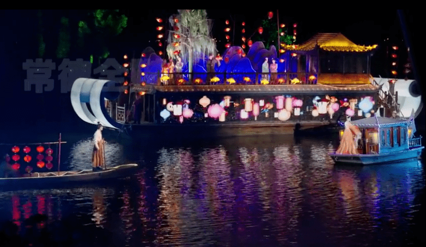 柳叶湖渔歌艺术营地内《柳叶船说》大型光影水秀表演,运用裸眼3D技术,依托柳叶湖丰富多元的本土文化,在神话传说《盘古开天》《刘海砍樵》的基础上,以刘禹锡的视角讲述了一段穿越千年的爱情传说。
