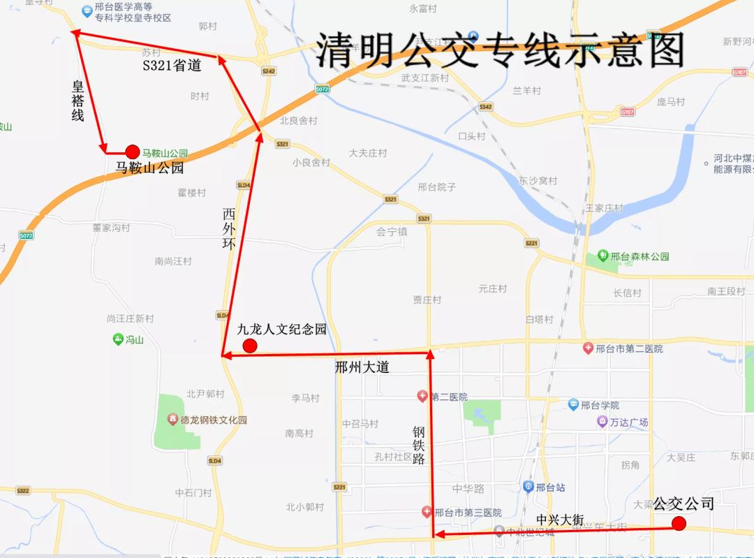 清明祭扫公交专线的线路走向为:由公交公司发车,途经中兴大街、钢铁北路、邢州大道、西环路、S321省道、皇褡线至马鞍山公园。