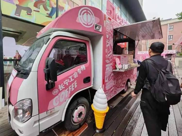 除了非遗文化,公益也是此次市集的一大特色,位于市集中间的一辆粉色“五一咖啡”大篷车显得格外亮眼。据主办方介绍,这辆大篷车来自附近的一家咖啡馆,为了凸显公益性,大篷车推出了面向工会会员的公益咖啡,仅需6元即可品尝到一杯可口的美式咖啡。“为了让广大职工感受到工会带来的福利,除了价格低廉的公益咖啡之外,我们其他的咖啡均比店内的价格低百分之二十到三十。”咖啡大篷车的负责人说道。