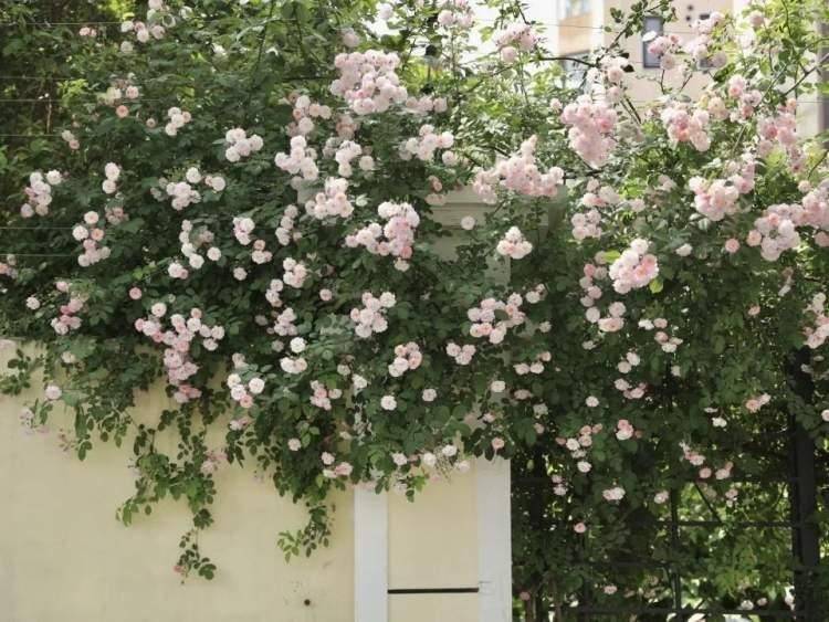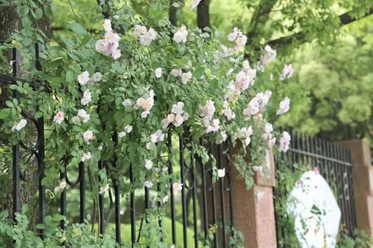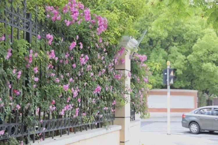 此处的蔷薇花位于位育中学和邹容公园的围墙外,攀爬在铁栅栏上,显得高级又复古。相较于华泾路东面的蔷薇,这里的花色更为丰富。