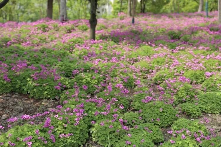 酢浆草总是被视为野花,甚至是杂草,其实酢浆草是市政绿化中最常见的草花。它栽培容易,管理粗放,非常适合绿地、花坛成片栽种。在华泾公园和世博绿色出行林可以看到成片的酢浆草争相开放,非常壮观。远处望去在绿叶间犹如星星点点,十分可爱。