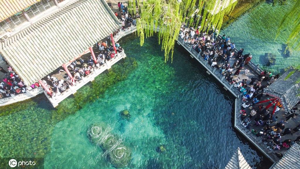 山东省济南市,在天下第一泉景区的趵突泉公园,每个泉池周边都挤满了来看泉水的游客,尤其在趵突泉三股水畔,人潮涌动,众多游客从不同的角度赏泉打卡拍照。