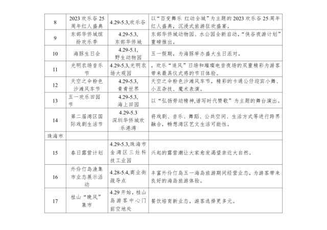 深圳欢乐海岸“五一”期间的“华裳东方”主题晚会依据“中国四季”文化元素为核心,结合杂技、舞蹈、乐器、情景演艺等艺术表现手法,运用新的节目形式、丰富文化内涵。水秀演出《深蓝秘境》则运用水幕、喷泉、激光、投影、火焰、音乐、烟花等多媒体艺术和技术成果,为游客呈现一场水与火、光与影的视听盛宴。