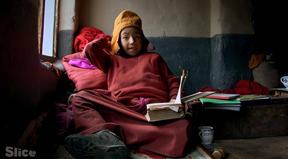 这里是在赞斯卡山谷,一个寺庙坐落在悬崖峭壁之中,这里似乎属于另一个星球,寺院里的僧侣们每天依旧按照中世纪的教规生活,大约20名不同年龄的少年僧侣,每天和年长的僧侣一起学习经文和哲学,并为众生祈祷。每天早上,肯拉普和其他小僧侣都穿上长袍,拿一个破旧的金属盆用冷水洗脸,然后通过昏暗的走廊去做早课,肯拉普是最小的僧侣,但他的理解能力和看待世界的意识,与年长的僧侣如出一辙,言行举止与其他少年僧侣形成鲜明的对比。当别的小僧侣想跟他玩时,他总是一脸不情愿的走开,然后以68岁的僧侣自居。