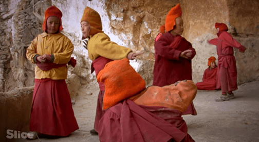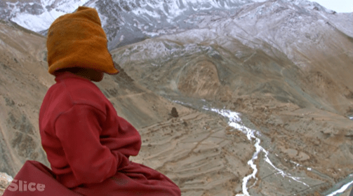 在返回寺庙的路上,积雪淹没过了脚踝,肯拉普穿着父亲前天给他缝的衣服,这时候的他又变回纯真的小孩,一边走一边唱着神圣的歌曲,经过陡峭的路段时,肯拉普又表现得像一位68岁的老僧侣,他对摄影师说:走在这样的路段,不能心生恐惧,如果你认为你会跌倒,你就会跌倒。如果你认为你不会跌倒,那么你就不会跌倒,每个人都要让自己的心强大。