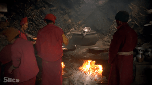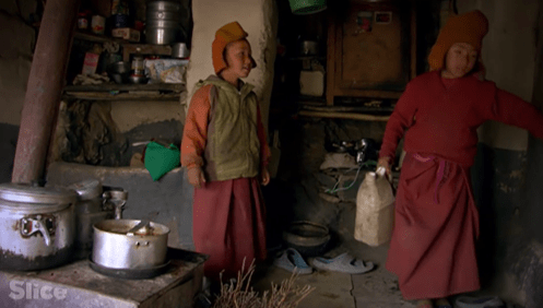 煮饭通常都由成年僧侣来完成,小僧侣则帮忙打下手,他们主要以面粉和米饭为主食,从不吃荤和饮酒,他们有着严格的行为准则,不能撒谎、不能偷窃、不能诽谤等等,他们的信仰就是慈悲,在进食之前,他们会先给寒鸦喂食。他们以去西藏为荣,肯拉普的叔叔-的叔叔曾经去过西藏,他交代等他去世后,他的一切衣物都要传给肯拉普,这种叔侄间的传承关系,就是僧侣的一种传承方式。