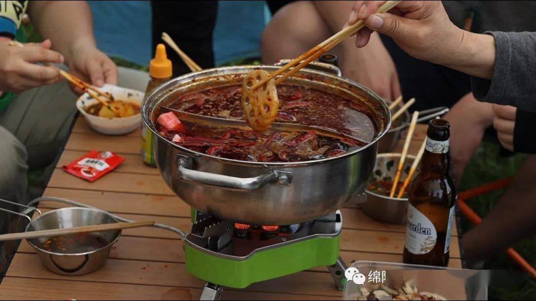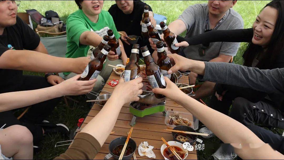 趁着“五一”节假期,游客杜文强也带着父母小孩和朋友一起出门露营。一群人坐在一起,吃着火锅、喝着啤酒,他们计划晚上就住在这里,看看春日的星空。