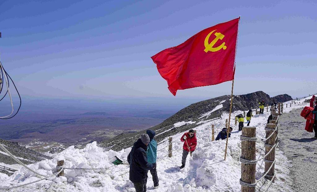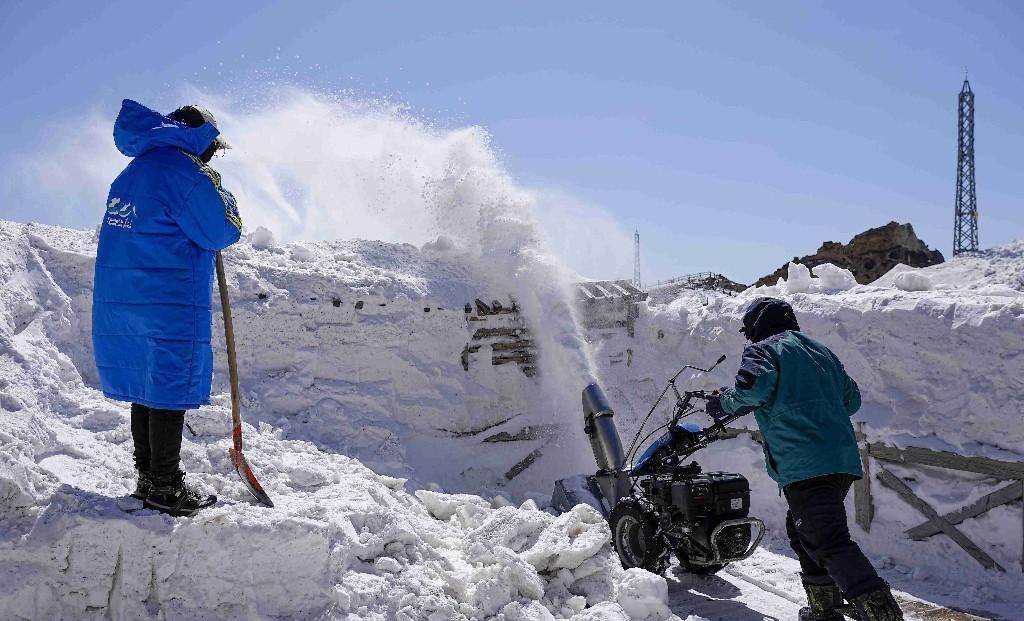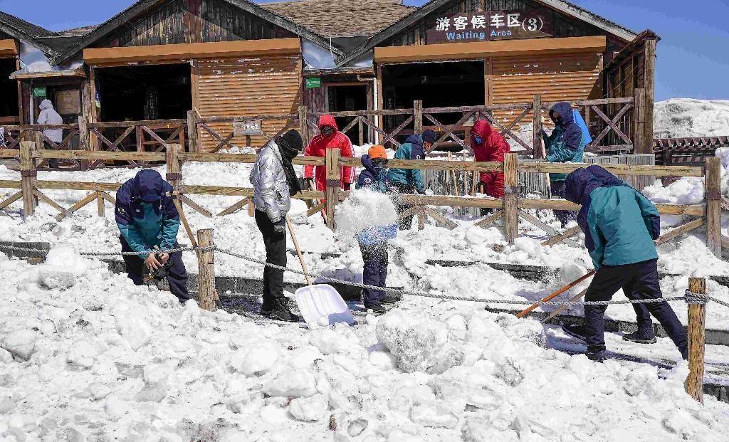 天池主峰是游客们必到的观景之地,虽然已近5月,但这里仍是白雪皑皑。为了让游客能顺利游览天池,工作人员们正手拿雪铲,顶着大风在清理栈道上的积雪残冰。