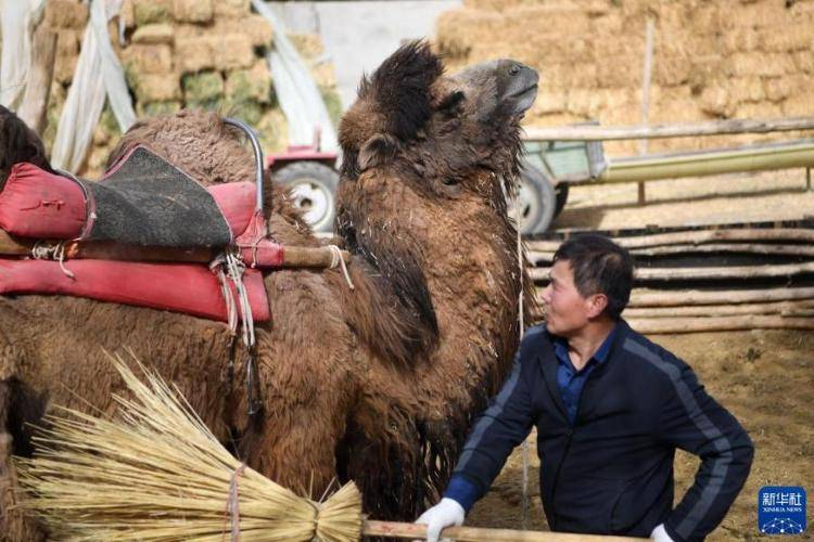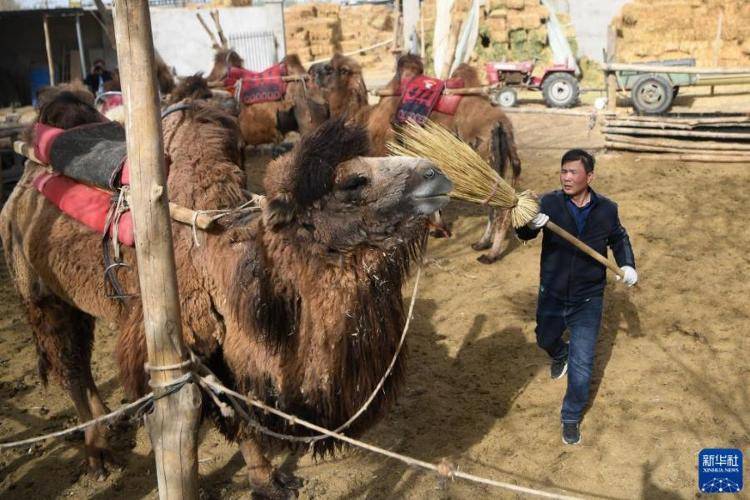 曹文华在驼圈里打扫卫生,为骆驼“上班”做准备(4月24日摄)。新华社记者 陈斌 摄