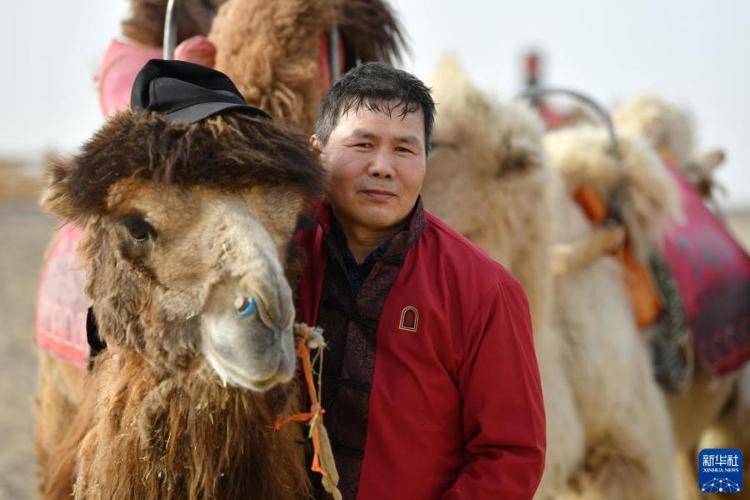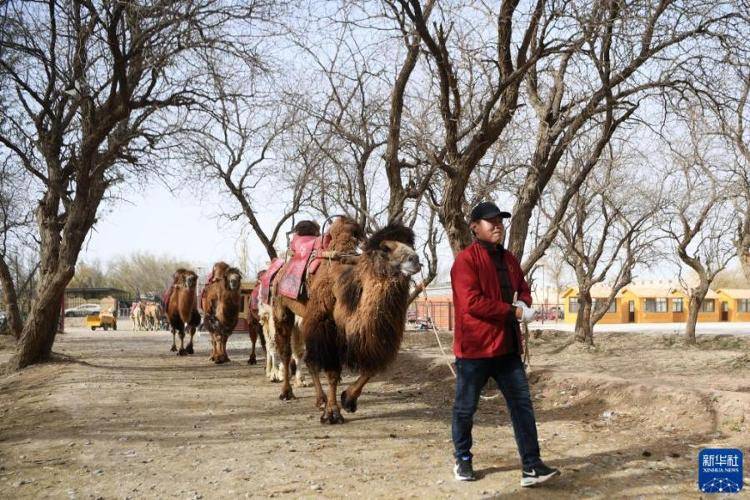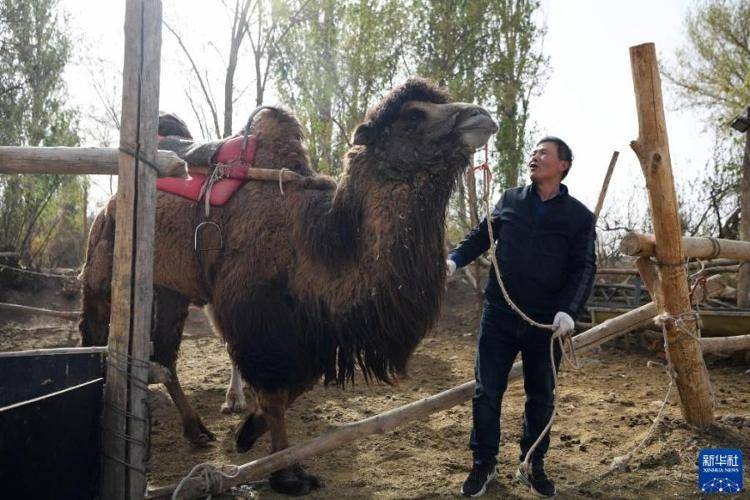 换上景区工作服的曹文华牵着骆驼准备“上班”(4月24日摄)。新华社记者 方欣 摄