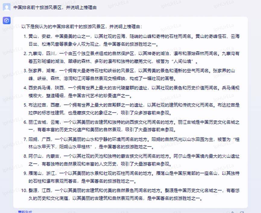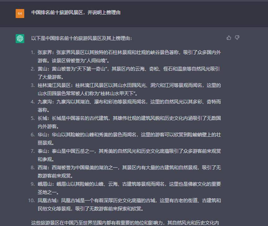 上面是人工智能ai给出答案,他们都提到了张家界、黄山、桂林、九寨沟,其他各有特色,你心目中的旅游风景区是什么,欢迎大家留言讨论。