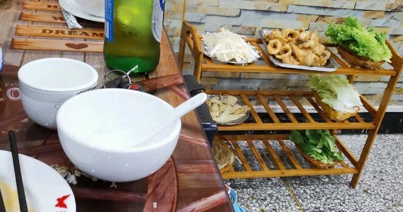 鱼肉吃完后就是涮青菜了,6个菜有生菜、白菜、油菜、金针菇、豆腐皮、粉皮等。四个人吃的还是挺满足的,一百多块钱花的值了。