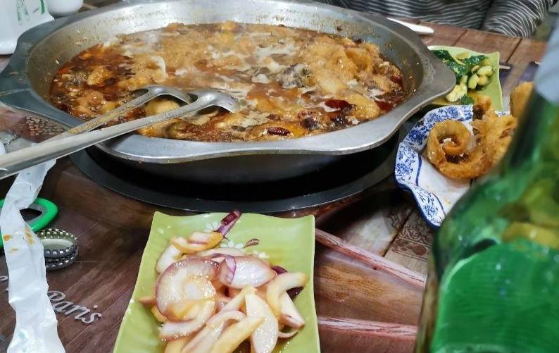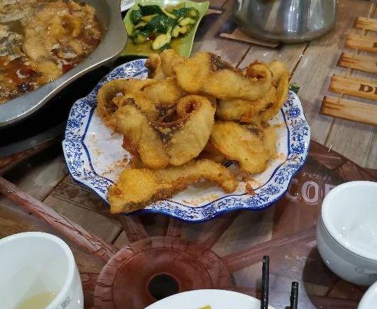 一会的功夫鱼锅做好了,加热后就能吃,这草鱼火锅是麻辣味的,汤底是鸡汤熬的高汤,味道鲜美可口,有个同事说份量不够,五六斤的大草鱼才多半盆的量!还一直在说“被坑了”。不一会儿服务员端来一盘酥炸鱼片,说这鱼两种吃法,这个是干吃的,鱼骨都炸酥了。