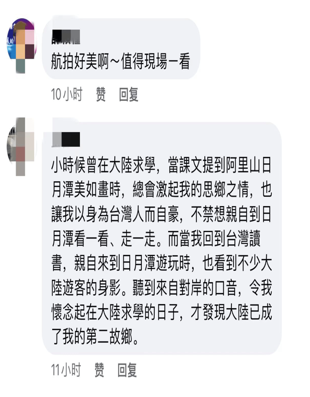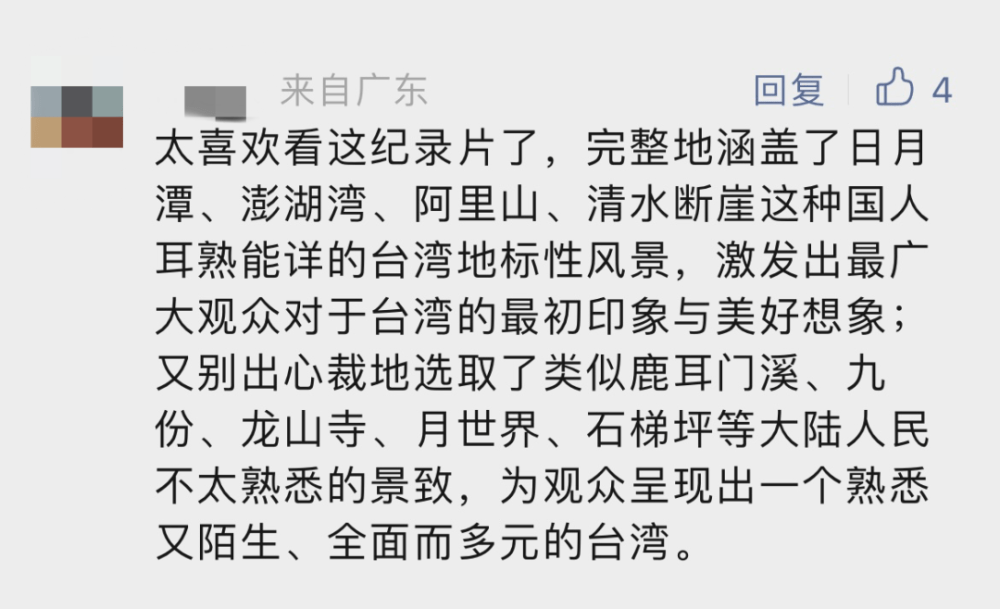 换个角度瞰台湾后,镜头中的美景也激发了台湾网友对大陆的思念,“小时候曾在大陆求学,当课文提到阿里山日月潭美如画时,总会激起我的思乡之情;而当我回到台湾,亲自来到日月潭游玩时,听到来自对岸的口音,才发现大陆已成了我的第二故乡。”