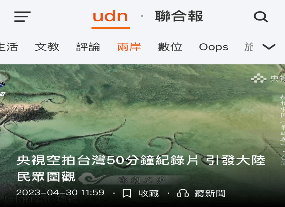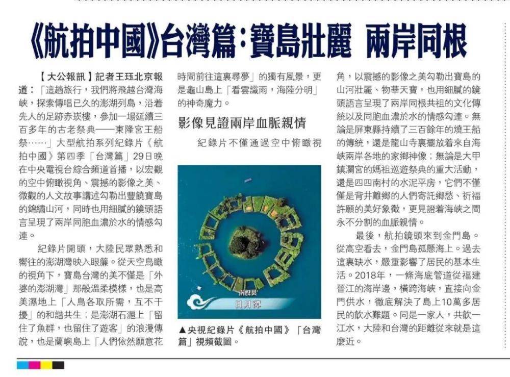 4月29日,中央广播电视总台大型航拍系列纪录片《航拍中国》第四季台湾篇在总台央视综合频道电视端首播,以宏观的空中视角俯瞰奇丽秀美的宝岛风光,以微观的人文故事讲述同根共祖的两岸传统。