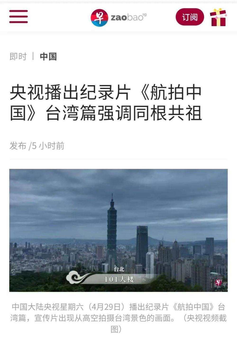 新加坡联合早报也发布文章《央视播出纪录片<航拍中国>台湾篇强调同根共祖》表示,节目出现从高空拍摄台湾景色的画面,央视解说词介绍两岸同根共祖的文化传统从未改变。