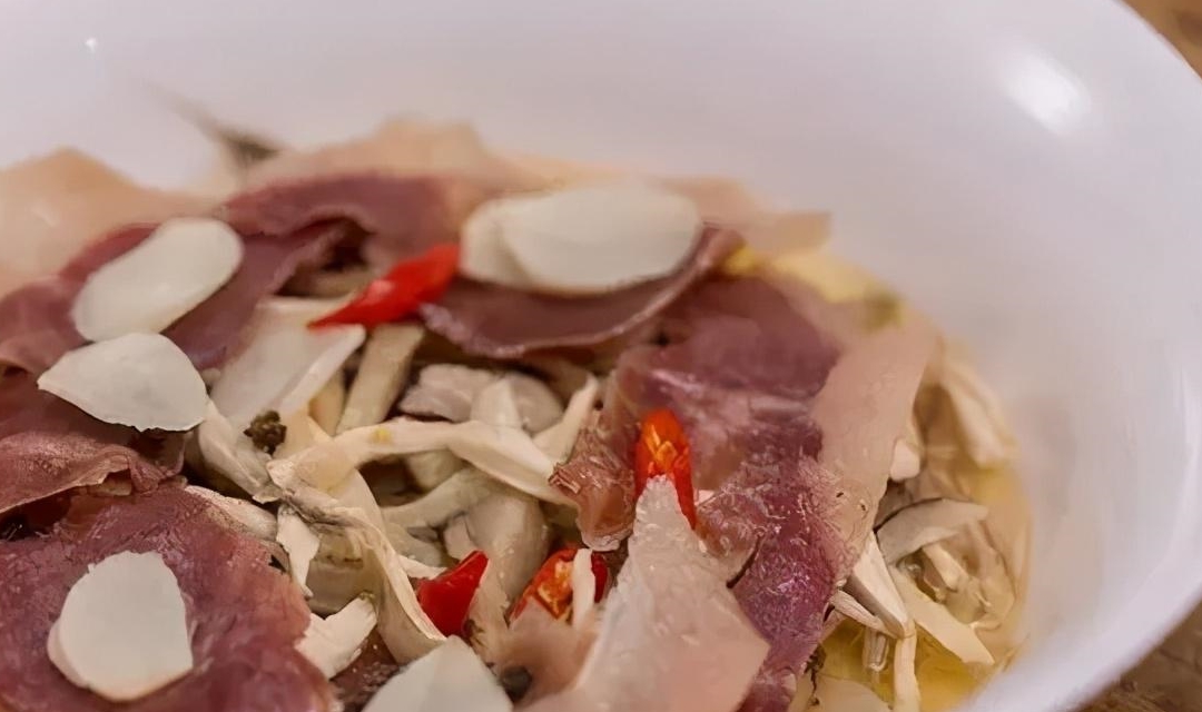 将鸡枞菌洗净、切好之后,加一勺猪油、一点盐,铺几片半肥半痩的火腿,其他什么都不放,也不加水,放在蒸屉上蒸熟即可。