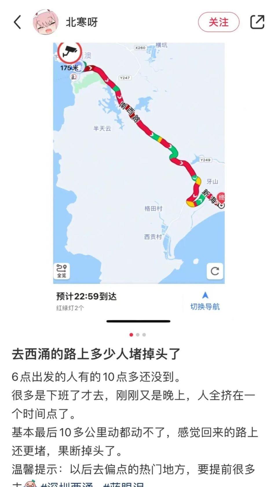 结果就是,一个普通的周四晚上,通往东部以及出入大鹏的道路堵车长达七公里,导航路况一路全线爆红,直至凌晨。