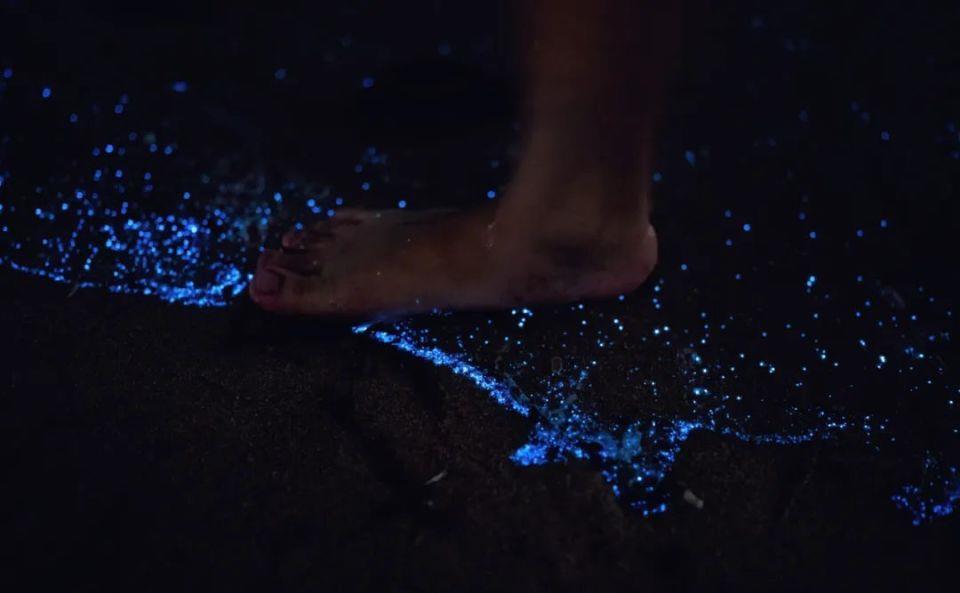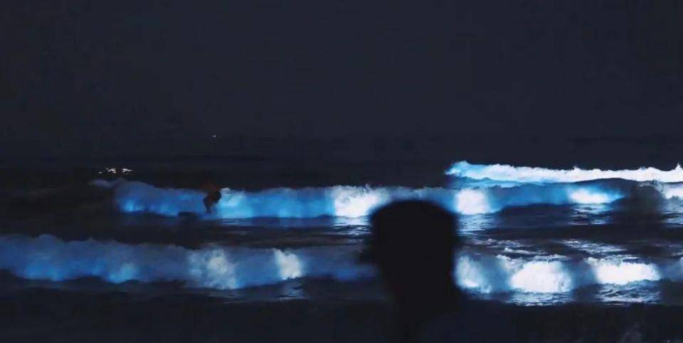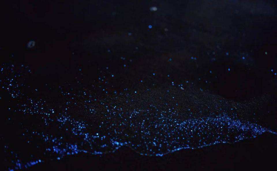 @莹:浪冲到岸边泛起蓝光点点,也属实浪漫了一回,和爱的人做任何事都值得被记录