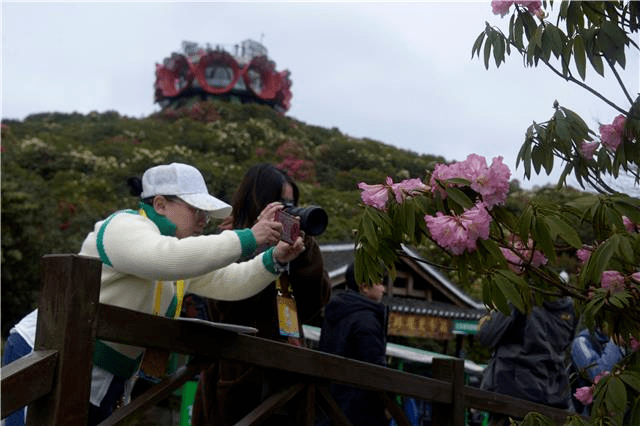 采风团成员用相机拍摄杜鹃花