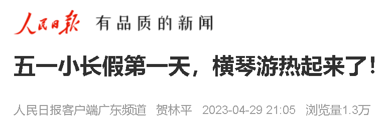 人民日报客户端报道,4月29日是“五一”假期第一天,横琴各大景区、景点开始迎接第一波客流高峰。长隆海洋王国度假区、花海长廊1号驿站等景点迎来一批批的游客,内蒙古、山西、江苏、广东其他城市以及澳门游客,都纷纷加入赏游横琴的队伍之中。