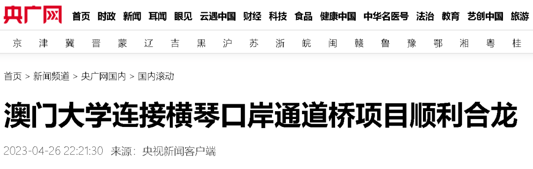 央广网、央视新闻客户端、中新网报道,澳门大学连接横琴口岸通道桥项目琴澳两侧桥梁日前实现顺利合龙,为确保今年下半年如期完工奠定了基础。项目位于澳门莲花大桥南侧,联通莲花大桥与澳门大学横琴校区,建成后将实现澳门大学横琴校区与内地互联互通。