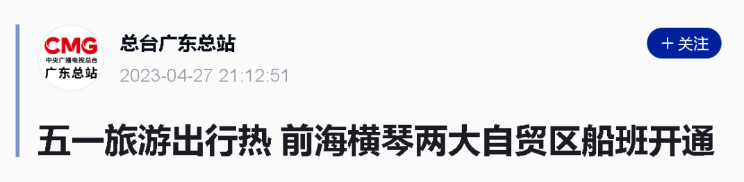 南方网、澳门日报报道,横琴粤澳深度合作区应对“五一”假期出游高峰,推出“超级水母节”“星光夏日嘉年华”等多项文旅活动吸引游客,助推文旅行业加快复苏。据了解,合作区已开通17条常规运营公交线路,覆盖岛内各片区,其中有14条公交线路经停横琴口岸,更加便利口岸出境人员前往横琴各个片区或景点。