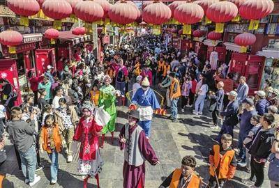 “五一”假期,南开区古文化街高跷、舞龙、舞狮等民俗花会踩街活动让游客进入“最天津、最民俗”的一站式体验。 本报记者 胡凌云 通讯员 石乔 刘顺利 摄