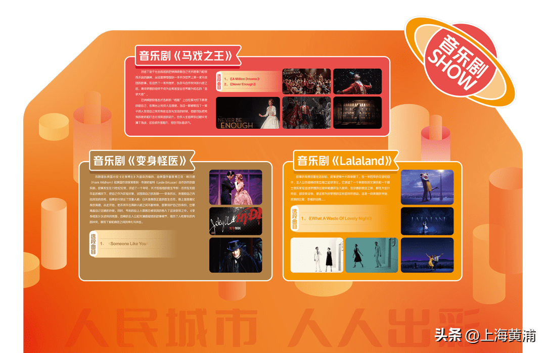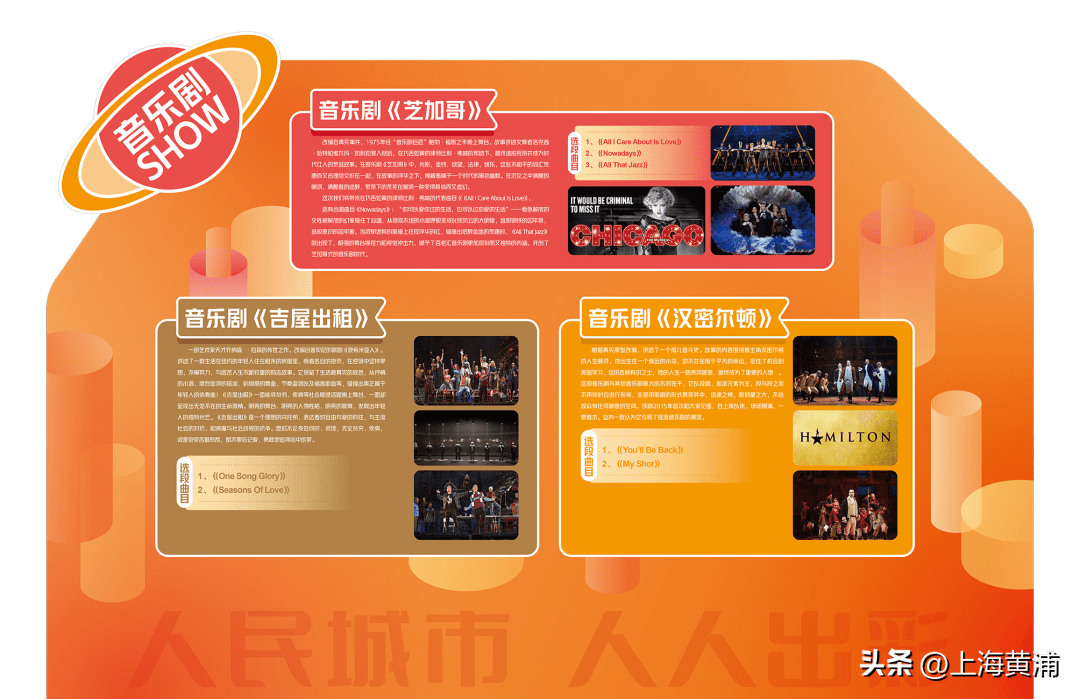 紧扣市民文化节“人民城市 人人出彩”的活动主题,区文化馆将奉上“悦享上海·艺美黄浦”海派风情文化体验活动 。在黄浦滨江公共空间 ,“经典音乐剧SHOW”的导赏活动精选了《芝加哥》《汉密尔顿》《吉屋出租》《沉默的真相》等中外经典音乐剧剧目中一些具有代表性的片段或歌曲,并由音乐剧知识介绍,展示不同风格音乐剧的独特艺术魅力,让观众近距离地了解和接触到音乐剧文化。