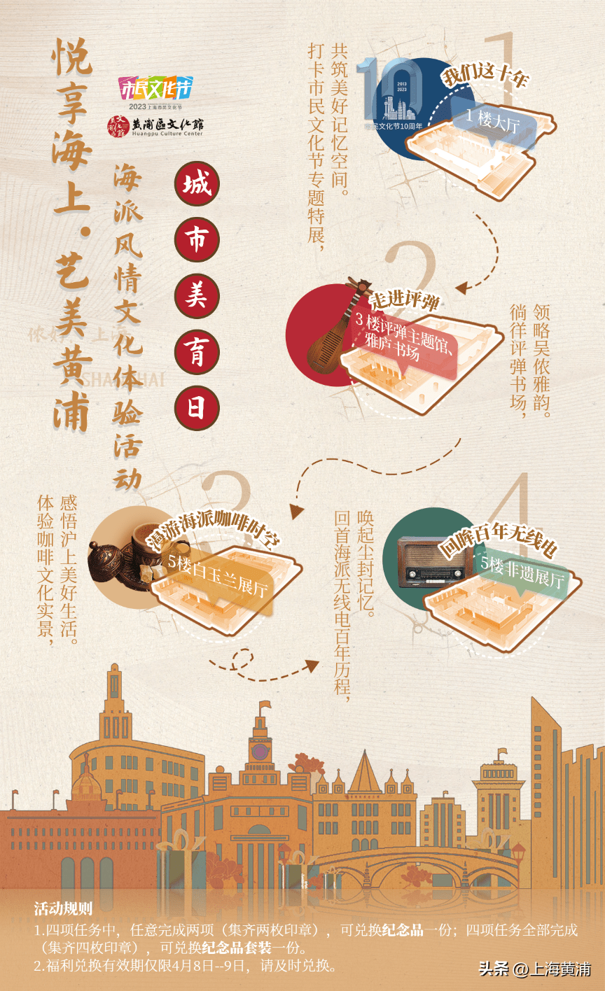 2013年,首届上海市民文化节初试啼声,开全国风气之先。在上海市民文化节迎来十岁生辰之际,“文化服务日”更名为“城市美育日”,推动上海市民文化节迈向新阶段开启新征程。记者从区文旅局获悉,4月8日“城市美育日”当天,区文化馆、区图书馆、明复图书馆、各社区文化活动中心将组织开展近50场美育系列活动,正式开启2023年上海市民文化节黄浦系列活动全年精彩。