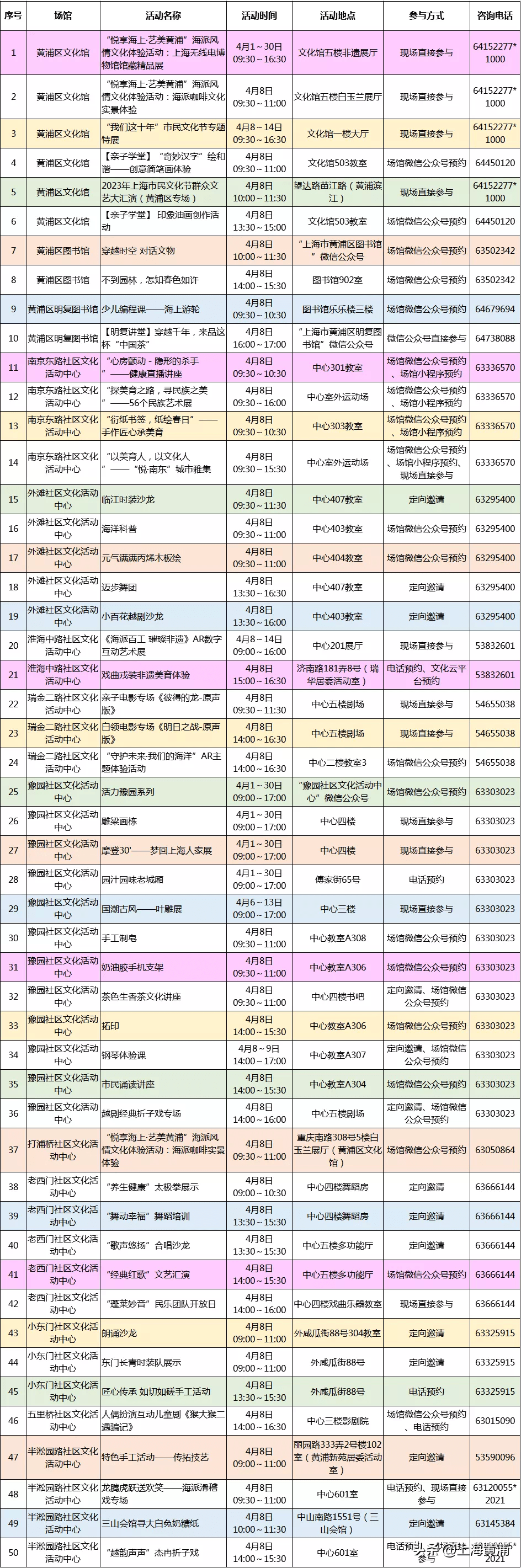 4月,黄浦区还将在区文化馆、区图书馆、明复图书馆和社区文化活动中心开展展演、展览、培训、讲座等多类别多形式的文化活动,进一步提升市民群众文化获得感和幸福感。