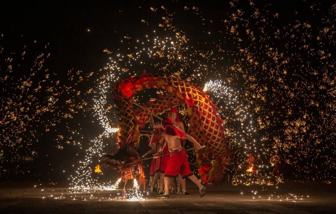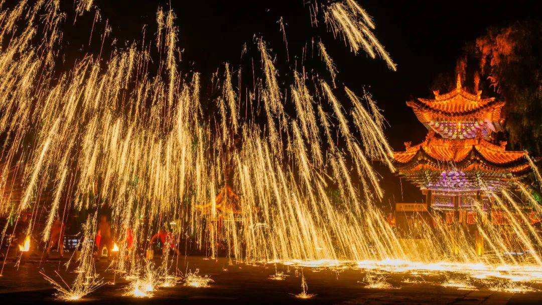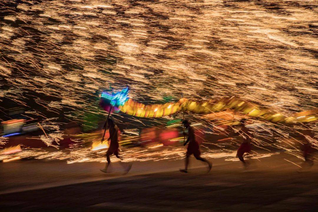 美到封神的千年非遗绝技“火龙钢花”划破夜空,1500℃的"铁水流星"随之漫天飞舞,“龙”与“火”的完美配合,演绎出现场的炫美磅礴、壮观。