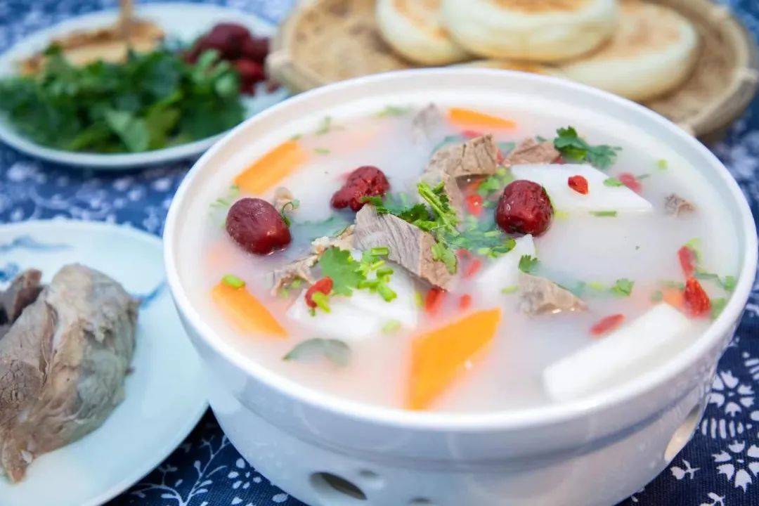 当地美食招牌之一的特色羊肉汤,堪称经典,一碗汁味鲜美的羊肉汤,再撒上新鲜的香菜末,放一些红红的辣椒油,汤浓、味美,真正的吃货,定不会放过这一份美味。