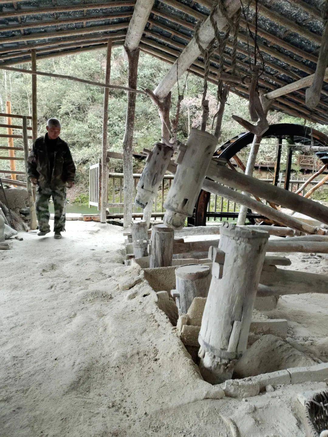 进入景区不远,便可听见水碓隆隆,转过小道,矿石堆前木坊黛瓦,坊边水轮车转动,坊内碓臼此起彼伏。水碓作坊的主人姓詹,他每日无暇观赏绕南美景,而是专心致志地观察着水碓工作,看到有个碓头不对劲,便停下水轮车检修一番。詹师傅说,这铁碓头用一年就得更换,木制的碓把也只能用四五年。之所以消耗大,是因为水碓要舂碎的是坚硬的矿石。
