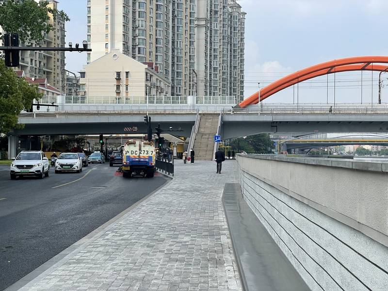 为此,在与码头建设方紧密沟通后,长宁区对码头周边的苏州河步道设施进行了新一轮拓宽:原先仅1.5米宽的彩色沥青步道拓宽至3米,并更换为10*10厘米的芝麻灰花岗岩拼贴地坪,与中山公园的路面配色相呼应,形成视觉统一;在码头钢引桥无障碍坡道西侧建造高0.2米、宽0.6米、长60米的观景小平台,在确保安全的前提下增强亲水性,同时对登船游客和观景行人进行分流。