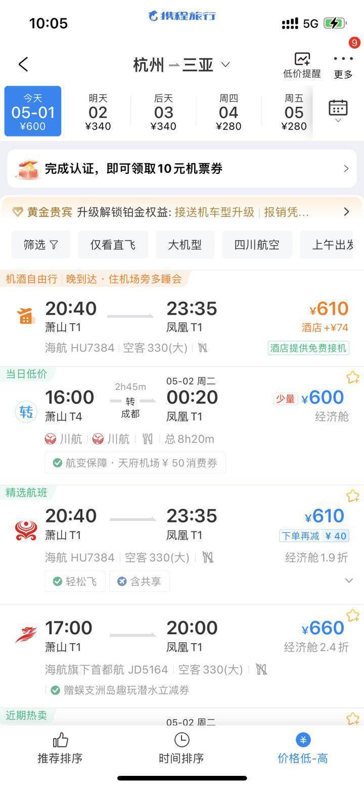 杭州飞热门海岛旅游城市三亚价格降的最为厉害。潮新闻记者曾在四月初写过报道,五一前,杭州飞三亚价格最低2800元,今天机票价格是610元,而到5月4日,杭州飞三亚居然只要280元。