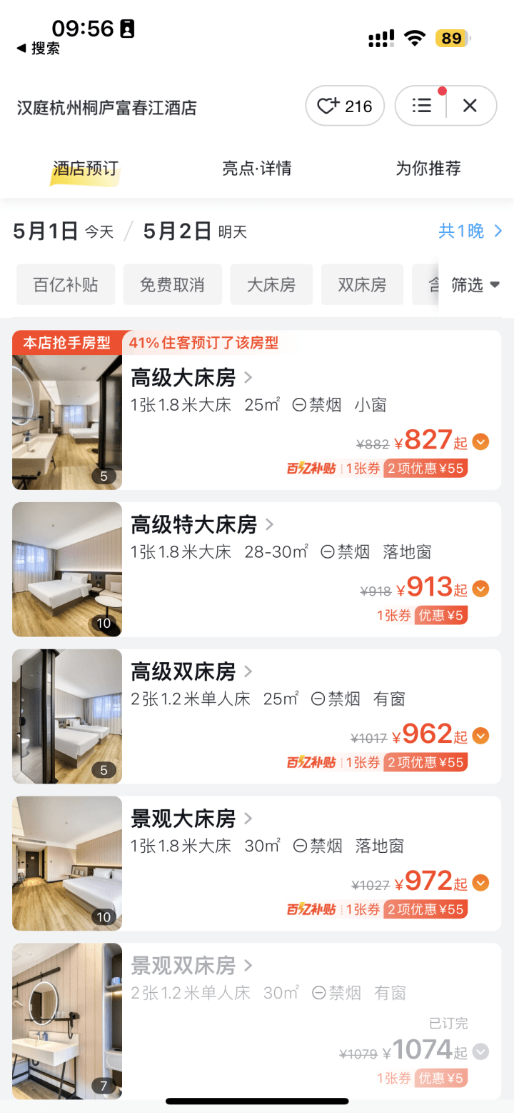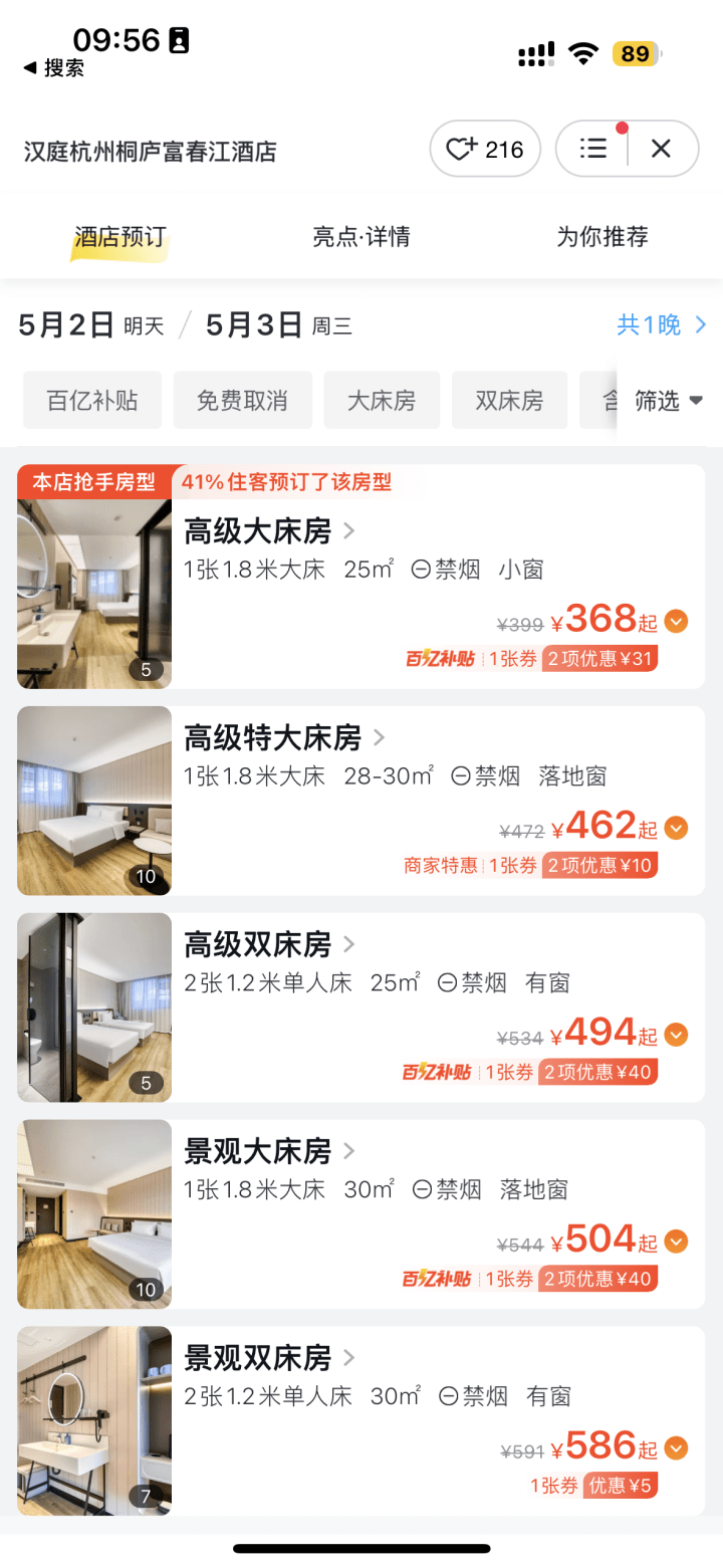 前段时间涨价1000多元的桐庐富春江汉庭酒店也降价了,5月1号房价是872元,5月2号恢复日常价格,376元。