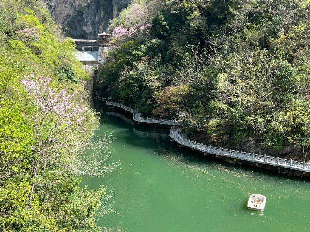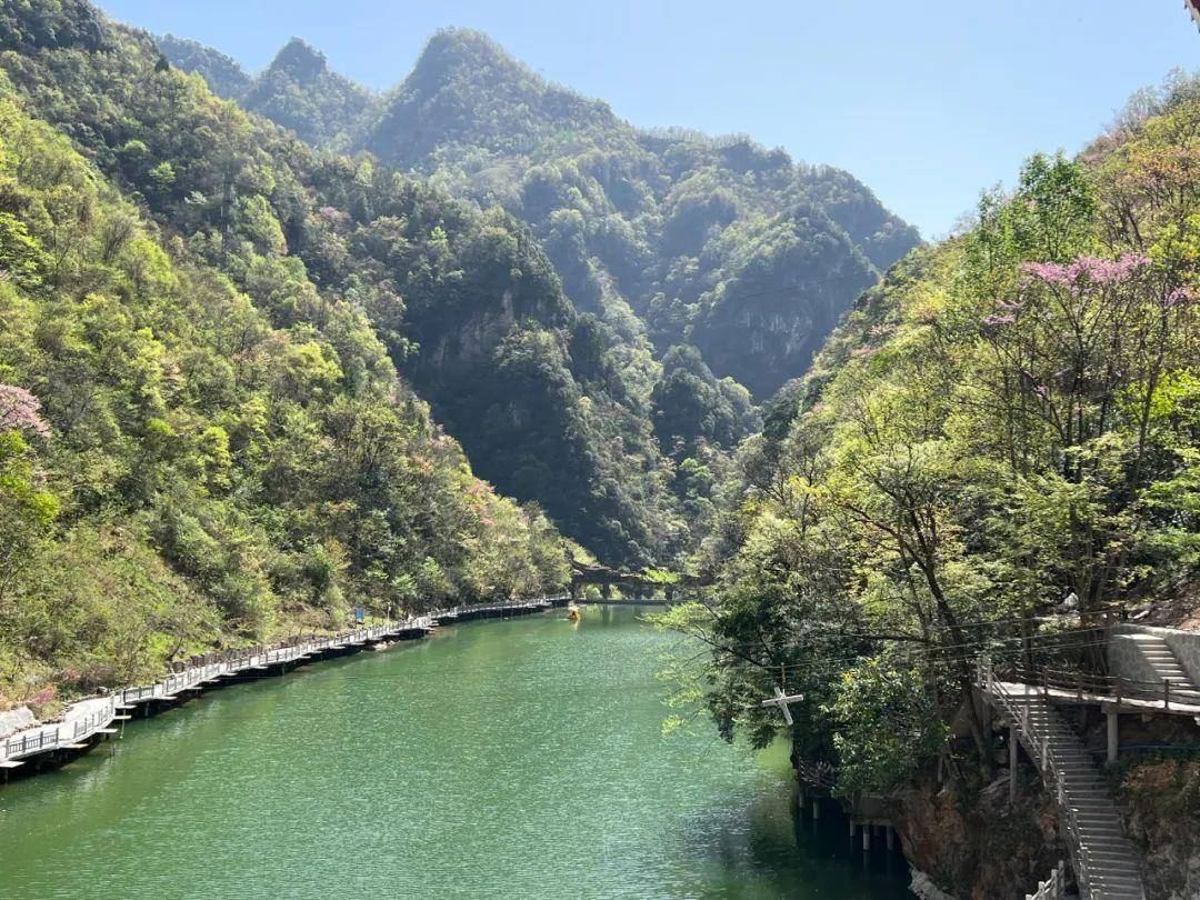 尧帝神峡:包含三湖、五峡、七园、九滩、十瀑、二十四桥。沿着溪谷栈道行走,空气沁人心脾。初春山林的新绿让人欣喜,溪水流经谷底碧如翡翠,山峰葱郁对峙,小道婉转迂回,阳光洒上峭崖瀑布,银练溅起点点白珠,远方峡口处数座廊桥飞架,紫荆烂漫生姿,春染水墨丹青,山明净水无尘。风闲庭信步繁华了一片世外桃源。