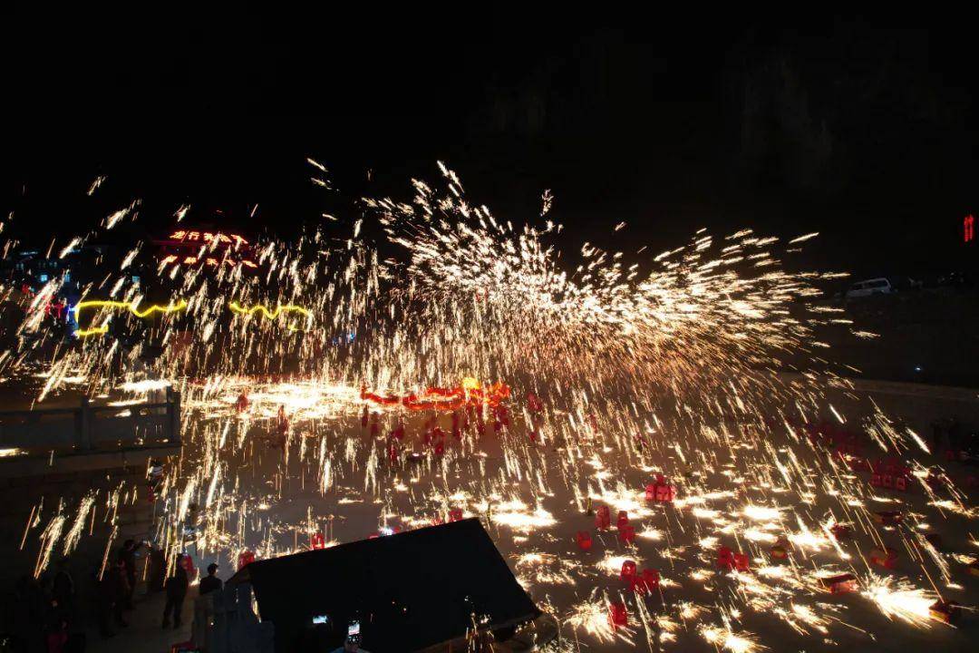 夜幕降临,文艺名家联袂登场,歌曲、舞蹈、龙凤呈祥、鲤鱼跳龙门、舞火龙、打铁花等丰富多彩的文艺汇演精彩纷呈。人们望眼欲穿等待国家级非物质文化遗产重庆铜梁火龙表演。当火龙浸夜色踏月而来,披战歌激情起舞,“铁水流星”铺天盖地划破浓郁黑暗,美轮美奂的绝技瞬间震撼全场。铜梁火龙长约20米,每条火龙由10人舞动,龙腾火耀时,高达1700°的熔化铁水猛烈撞击成激射的金花,撒向火龙上空。龙头龙身喷射的火花和铁水浇洒的金花相互辉映点亮夜空,火龙在“铁水流星”中翻腾飞舞,美轮美奂的绝技震撼全场。此时此刻,在遥远的尧乡,龙文化带我们全程体验中国式高能浪漫。