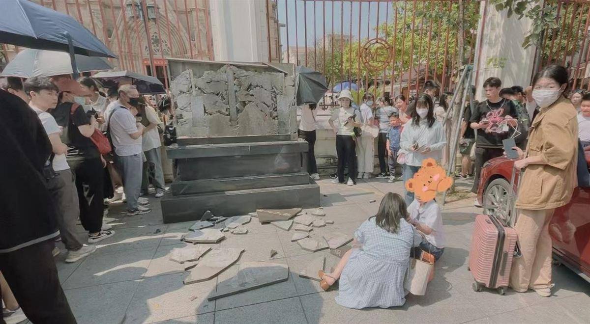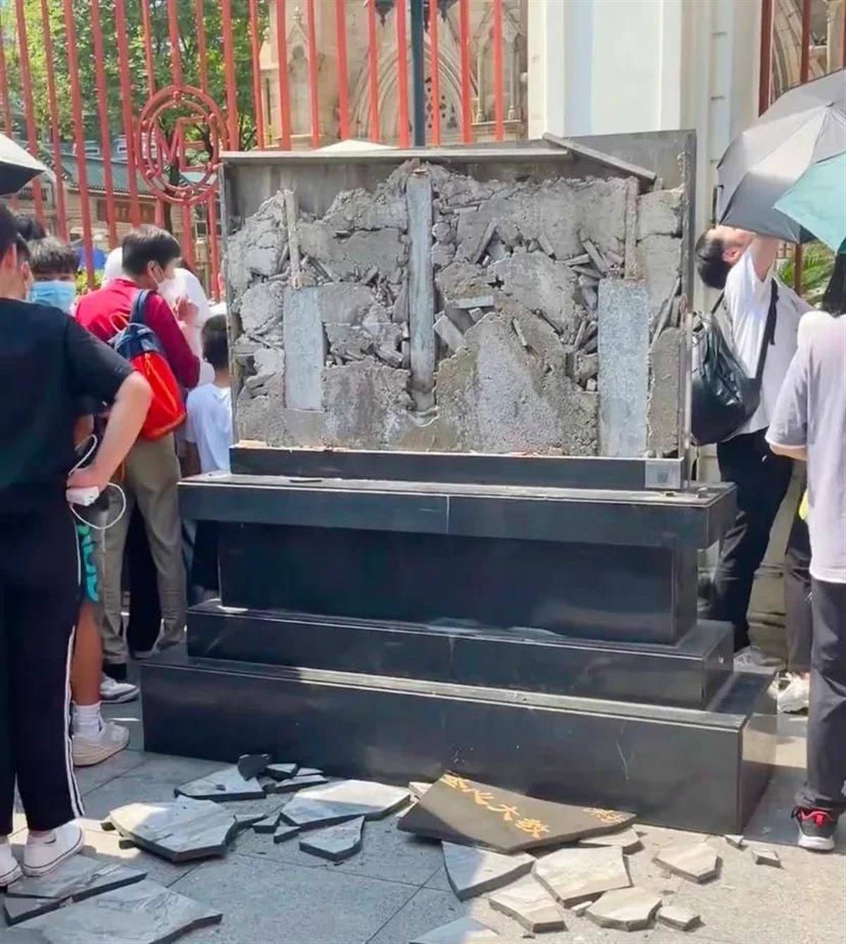 广州圣心大教堂的文物保护标志碑碎了(网络视频截图)