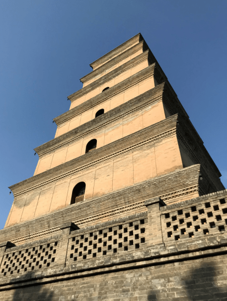 大雁塔又名“慈恩寺塔”,是我国现存最早、规模最大的唐代四方楼阁式砖塔。唐永徵三年(652年),玄奘为保存由天竺经丝绸之路带回长安的经卷佛像,主持修建了大雁塔,最初五层,后加盖至九层,再后层数和高度又有数次变更,最后固定为今天所看到的七层塔身。大雁塔每层四面均有券门,塔身通高64.517米,底层边长25.5米。
