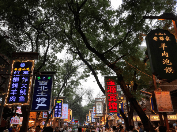 回民街类似于重庆磁器口、成都宽窄巷子,不同的是回民街的特色美食和名小吃,主要偏向以清真为主,整条街都是羊肉泡馍、肉夹馍、牛羊杂汤、biang biang面、岐山臊子面、红柳羊肉串、烤鱿鱼等美食小吃。一路旅途奔波,大家都感觉有点饿了,转悠了一通,实在不知在哪家停歇吃饭,最后选择了朋友推荐的“老孙家泡馍”,随便叫了一两种面食,10元一串的红柳羊肉串自然是必须的。一顿狼吞虎咽后,时候已不早了,回酒店一番洗漱后躺在床上,看着身边的妻儿和窗外渐暗的天幕,逐渐进入梦乡,这是来到西安的第一晚。