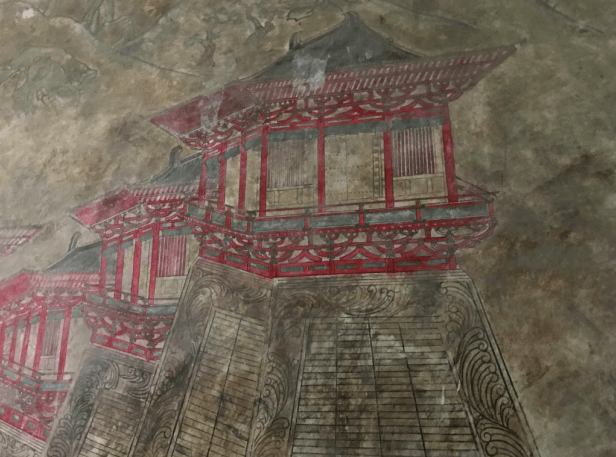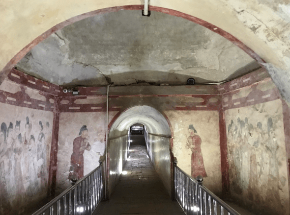 在游览懿德太子墓时,偶遇了几个旅游团,人不算很多。进入斜坡墓道后,一股地下寒气袭来,越往下走越甚之。墓道两旁为墓室壁画,壁画上主要刻画了人物、马匹、阙楼等内容,其中阙楼图是唐代建筑绘画之佳品,亦是唐代阙楼实物的形象资料,十分珍贵,原壁画现已完整切割至陕西历史博物馆唐代壁画珍品馆保存;小龛内摆放了俑、三彩器等物件;斜坡墓道的尽头处便是一圆形平地,面积不大,甚至可以说是狭小,顶部为墓穴中心封土堆,平地上的玻璃栏栅里安置着一具庞大的懿德太子夫妻合葬的墨玉棺椁。