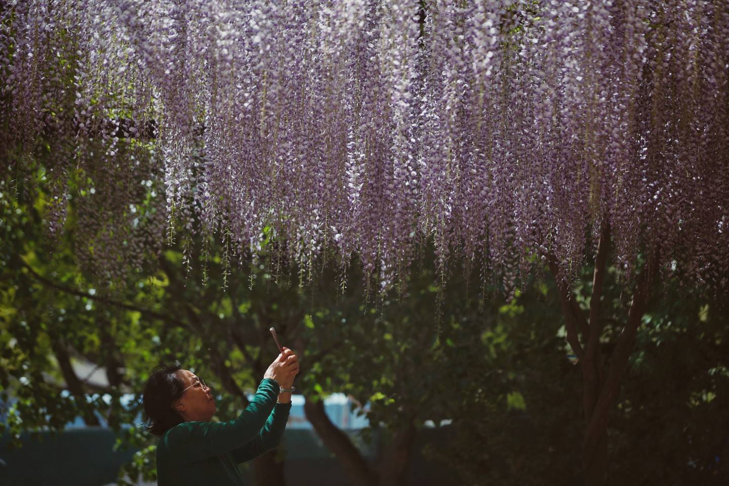 4月18日,玉渊潭公园,一位游客拍摄瀑布般的紫藤花。新京报记者 薛珺 摄