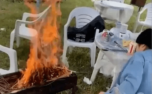 2022年3月27日,浙江省嘉兴市一市民约好朋友一起去 户外露营烧烤。在烧烤过程中因为觉得火太小,其中一人拾来不少枯树枝,岂料加入枯树枝后,烤架内的火焰蹿起数米高, 猛烈燃烧直到把烤架都给烧穿。